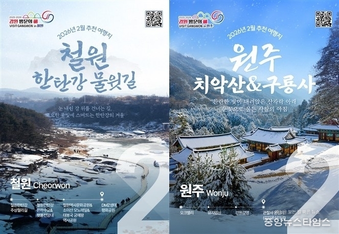 (중앙뉴스타임스 = 방재영 기자) 강원특별자치도와 강원관광재단은 ‘2026 강원 방문의 해’ 2월 추천 여행지로 철원군과 원주시를 선정하여 대대적인 홍보마케팅을 추진한다고 25일 밝혔다.