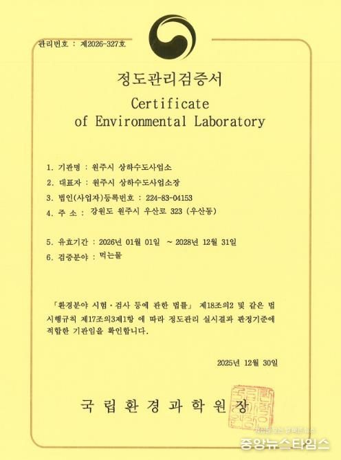 (중앙뉴스타임스 = 방재영 기자) 원주시 먹는물 검사기관이 국립환경과학원이 주관한 ‘2025년 먹는물 검사기관 정도관리 평가’에서 엄정한 심사를 거쳐 ‘적합’ 판정을 받았다. 이에 따라 2026년 1월 1일부터 2028년 12월 31일까지 유효한 ‘정도관리 검증서’를 공식 획득했다.