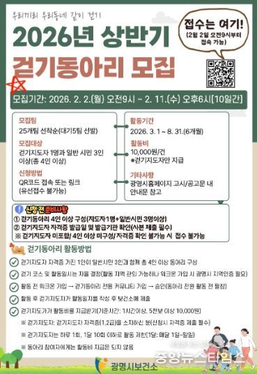 (중앙뉴스타임스 = 방재영 기자) 광명시가 시민의 건강 증진과 일상 속 걷기 문화 확산을 위해 오는 2월 2일부터 11일까지 ‘2026년 상반기 걷기동아리’ 참가팀을 모집한다고 26일 밝혔다.