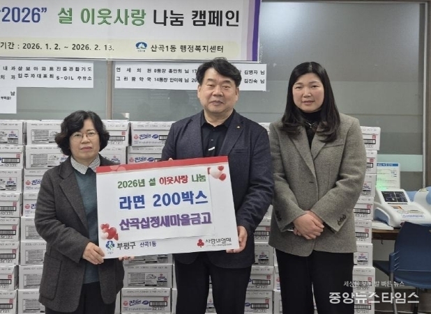 (중앙뉴스타임스 = 방재영 기자) 인천 부평구 산곡1동은 지난 27일 산곡십정새마을금고로부터 ‘2026 설 이웃사랑 나눔’ 성품으로 라면 200박스를 기탁 받았다.