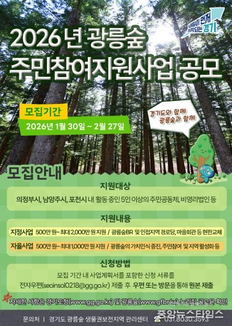 (중앙뉴스타임스 = 방재영 기자) 경기도가 광릉숲 생물권보전지역 활성화를 위해 2026년 광릉숲 주민참여지원사업 참여자를 모집한다.