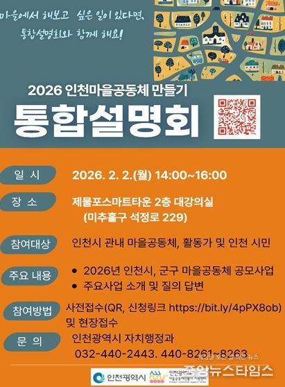 (중앙뉴스타임스 = 방재영 기자) 인천시는 오는 2월 2일 제물포스마트타운 2층 대강의실에서‘2026년 인천광역시 마을공동체 만들기 통합설명회’를 개최한다고 30일 밝혔다.