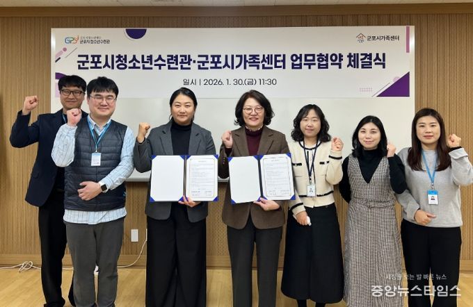 (중앙뉴스타임스 = 방재영 기자) (재)군포시청소년재단 군포시청소년수련관(관장 박윤정)과 군포시가족센터(센터장 박성희)는 1월 30일, 군포시청소년수련관 3층 어학실에서 다문화가정을 포함한 청소년의 건강한 성장과 전통문화 가치 확산을 위한 업무협약(MOU)을 체결했다.