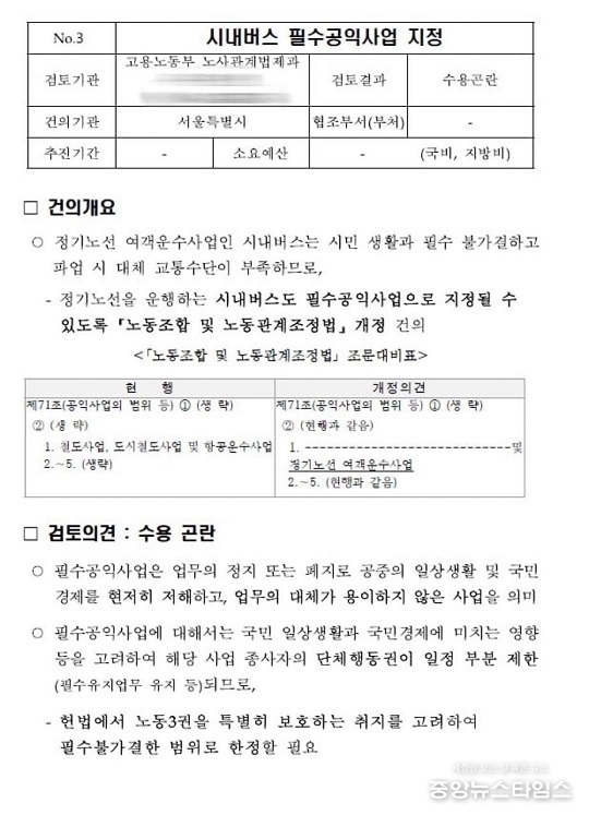 버스노동자들은 “필수공익사업 지정은 헌법이 보장한 노동3권 가운데 단체행동권을 직접적으로 제한하는 제도”라며 “위헌 소지가 끊이지 않아 철폐돼야 할 악법임에도, 서울시는 시대를 역행하는 법 개정에 나서고 있다”고 비판했다. 이어 “이는 서울시버스노동조합의 정당한 파업 과정에서 드러난 행정 무능을 가리기 위한 책임 회피에 불과하다”고 주장했다.