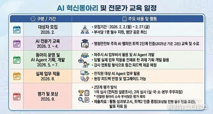 이번 프로젝트의 핵심은 ‘전문성’과 ‘활용성’이다. 참여 직원들은 7명씩 12개 팀으로 나뉘어 활동하며, 행정안전부 주관 ‘인공지능(AI) 챔피언’인증 취득을 목표로 전문 교육을 이수할 계획이다. 각 팀은 부서 특성에 맞춰 실제 업무에 즉시 투입할 수 있는 ‘인공지능(AI) 에이전트’를 직접 기획하고 개발하는 실무 과제를 수행한다.