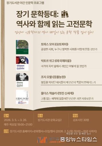 (중앙뉴스타임스 = 이광운 기자) 김포시 장기도서관은 야간 인문학 프로그램 ‘장기 문학등대: 역사와 함께 읽는 고전문학’을 오는 3월 5일부터 3월 26일까지 매주 목요일 저녁 7시에 장기도서관 문화교실2에서 운영한다고 2일 밝혔다.