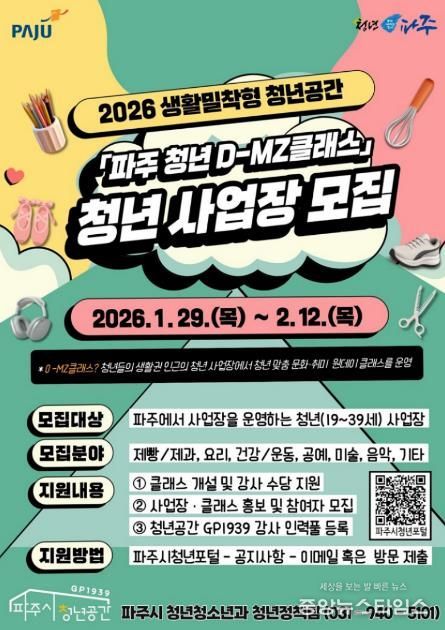 (중앙뉴스타임스 = 방재영 기자) 파주시가 지역 청년이 운영하는 사업장을 활용해 청년 대상 문화·취미 프로그램을 운영하는 2026 생활밀착형 청년공간, ‘파주 청년 디(D)-엠지(MZ)클래스’에 참여할 청년사업장을 모집한다.