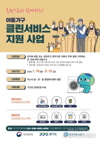 (중앙뉴스타임스 = 방재영 기자) 경기도에서 열악한 주거환경에 거주하는 아동가구들을 위한 ‘아동가구 클린서비스 지원 사업’을 복권기금과 함께 추진한다.고 3일 밝혔다.