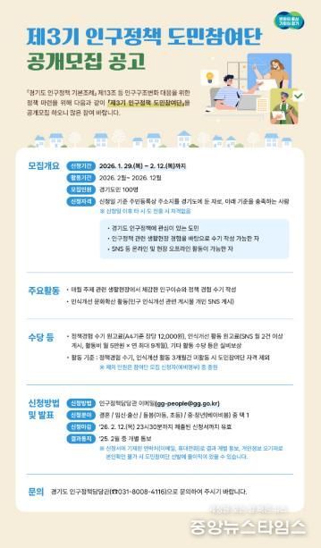 (중앙뉴스타임스 = 방재영 기자) 경기도가 정책 대상자가 직접 정책개선에 참여하는 ‘제3기 인구정책 도민참여단’ 100명을 공개 모집한다.