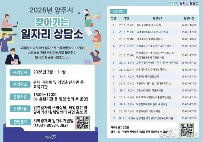 (중앙뉴스타임스 = 방재영 기자) 양주시가 구직 현장의 문턱을 낮추고 시민들의 취업 성공률을 높이기 위해 오는 11월까지 ‘2026년 찾아가는 일자리 상담소' 를 운영한다.