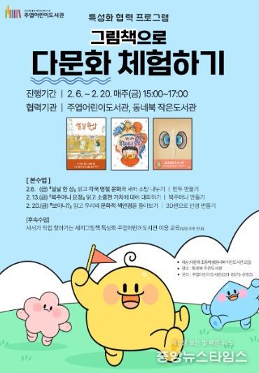 (중앙뉴스타임스 = 이광운 기자) 고양특례시 주엽어린이도서관은 겨울방학을 맞아 다문화 초등학생을 대상으로 특성화 협력 프로그램 ‘그림책으로 다문화 체험하기’를 운영한다.