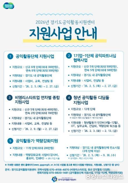 (중앙뉴스타임스 = 방재영 기자) 경기도공익활동지원센터가 ‘2026년 경기도 공익활동 지원사업’에 참여할 도내 공익활동 단체를 모집한다.
