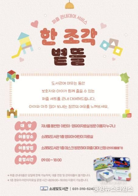 (중앙뉴스타임스 = 방재영 기자) 시흥시 소래빛도서관은 어린이를 위한 관내 퍼즐 대여 서비스 ‘한 조각 볕뜰’을 새롭게 선보인다. 이 서비스는 빠른 영상과 즉각적인 자극에 익숙해진 아이들이 잠시 속도를 늦추고, 손끝 감각과 집중력을 자연스럽게 기를 수 있도록 마련됐다.