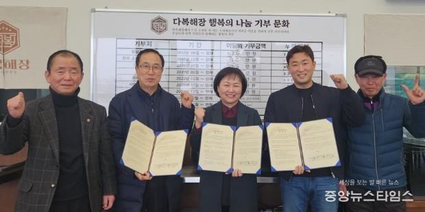 (중앙뉴스타임스 = 방재영 기자) 파주시 교하동은 지난 4일, 김택철 교하동 지역사회보장협의체 위원장, 이근복 교하동 노인회 분회장, 이만형 문발리 경로당 노인회장이 참석한 가운데 문발동에 위치한 다복해장에서 이웃사랑 실천을 위한 ‘교하사랑나눔가게’협약을 체결했다.