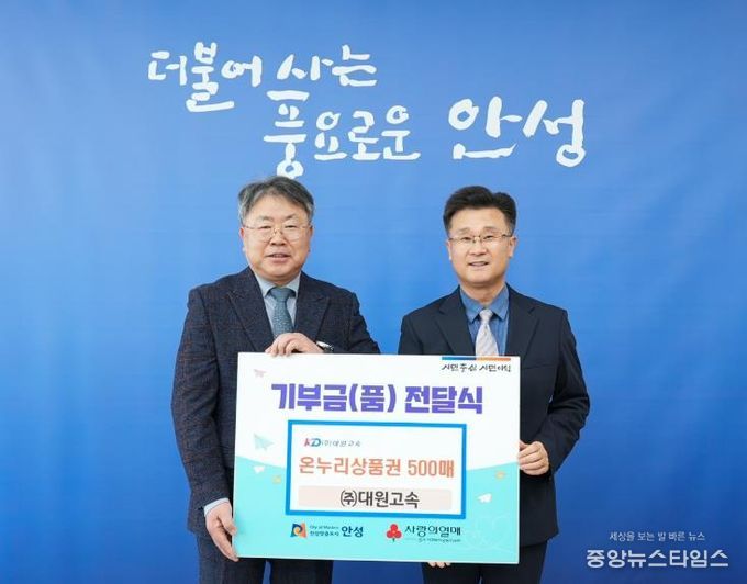 (중앙뉴스타임스 = 방재영 기자) 안성시는 3일 대원고속으로부터 지역의 어려운 이웃을 돕기 위한 온누리상품권 500매(500만 원 상당)를 전달받았다고 밝혔다.