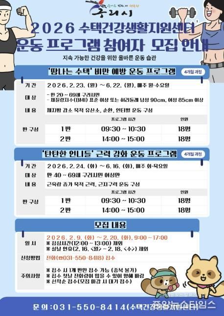 (중앙뉴스타임스 = 방재영 기자) 구리시 수택건강생활지원센터는 오는 2월 9일부터 성인과 중장년층의 비만 예방과 근력 강화를 위한 맞춤형 운동프로그램인 ‘땀나는 수택’과 ‘탄탄한 언니들’의 참여자를 모집한다고 5일 밝혔다.