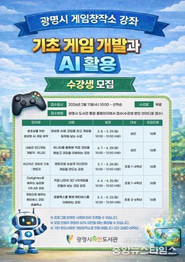 (중앙뉴스타임스 = 방재영 기자) 광명시 게임창작소는 오는 11일 오전 10시부터 상반기 시민 교육 프로그램인 ‘기초 게임 개발과 인공지능(AI) 활용’ 강좌의 수강생을 모집한다고 8일 밝혔다.