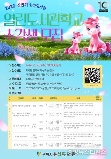 (중앙뉴스타임스 = 방재영 기자) 광명시 소하도서관이 ‘2026년 상반기 열린도서관학교’ 수강생을 모집한다고 8일 밝혔다.