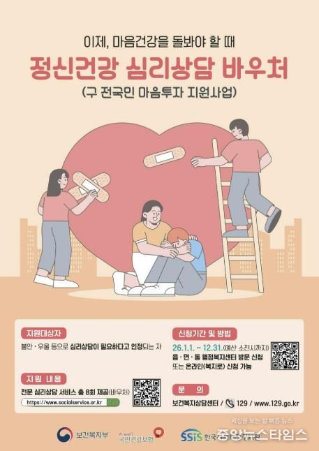 (중앙뉴스타임스 = 방재영 기자) 성남시는 우울, 불안, 스트레스 등으로 정서적 어려움을 겪는 시민을 위해 ‘정신건강 심리상담 바우처 사업(옛 전국민 마음투자 지원사업)’을 시행한다고 9일 밝혔다.