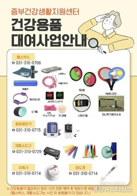 (중앙뉴스타임스 = 방재영 기자) 시흥시 중부건강생활지원센터는 시민의 건강생활 실천을 돕기 위해 헬스박스, 혈압ㆍ혈당, 염도계, 재활 소도구, 유축기 등 다양한 건강용품 대여 사업을 운영하고 있다.