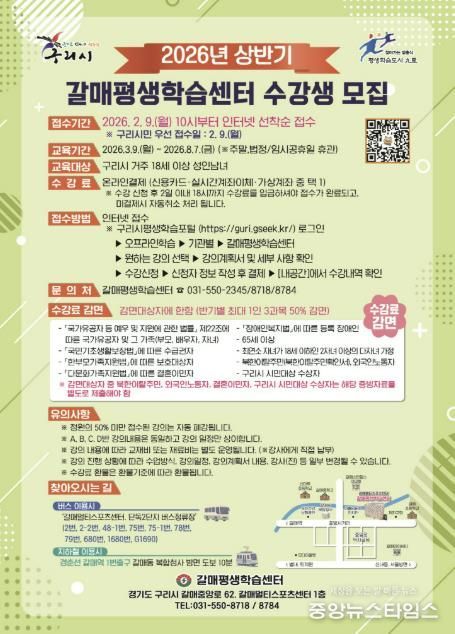 (중앙뉴스타임스 = 방재영 기자) 구리시는 구리시평생학습관, 갈매평생학습센터, 수택평생학습센터에서 운영하는 2026년 상반기 평생학습 강좌의 수강생을 모집한다고 9일 밝혔다.