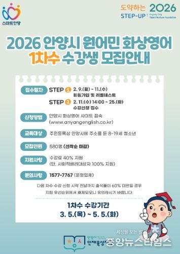 ‘2026 안양시 원어민 화상영어’ 1차수 모집 기간은 2월 9일 오후 2시부터 11일까지이며, 총 580명을 모집한다. 회원가입 및 레벨테스트를 진행한 후, 2월 11일 오후 2시부터 2월 25일까지 수강 신청을 받는다.