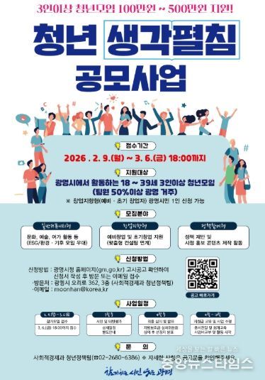시는 청년의 창의적인 아이디어를 실제 활동으로 펼칠 수 있도록 돕는 ‘2026년 청년 생각펼침 공모사업’ 참여팀을 오는 3월 6일까지 모집한다.