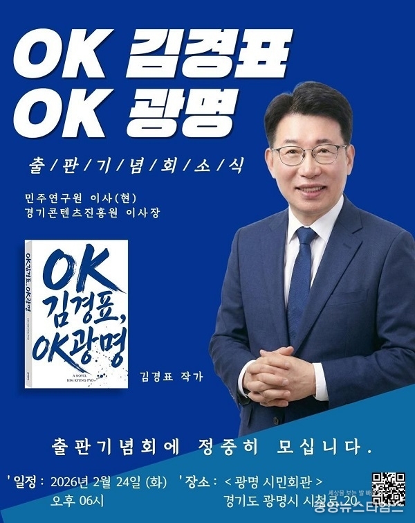(중앙뉴스타임스 = 방재영 기자) 더불어민주당 정책 싱크탱크인 민주연구원 김경표 이사가 오는 24일 오후 6시 광명시민회관 대공연장에서 저서 ‘OK김경표, OK광명’의 출판기념회를 열고 정책 비전을 공개한다고 9일 밝혔다.