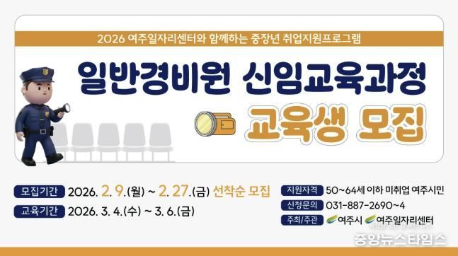 (중앙뉴스타임스 = 방재영 기자) 여주시는 중장년층의 재취업을 돕기 위해 2026년 여주시 중장년 일반경비원 신임교육과정 교육생을 모집한다고 10일 밝혔다.