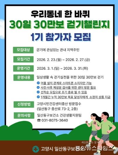 (중앙뉴스타임스 = 방재영 기자) 고양특례시 일산동구보건소는 지역 주민의 기초 체력 증진과 신체활동 활성화를 위해 기획한‘우리동네 한 바퀴 30일 30만보 걷기 챌린지’1기 참가자를 오는 23일부터 모집한다.