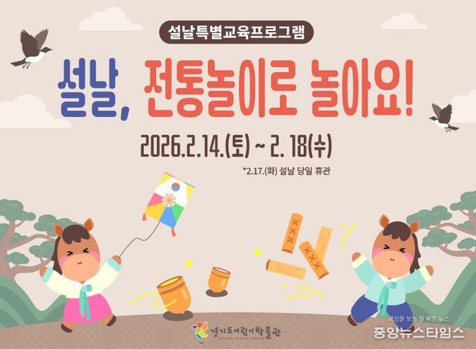 (중앙뉴스타임스 = 방재영 기자) 경기문화재단 경기도어린이박물관은 설날을 맞이하여 2026년 2월 14일부터 2월 18일까지 설날 특별프로그램 '설날, 전통놀이로 놀아요!'를 운영한다. 설 연휴 동안 박물관을 방문하는 어린이와 동반 가족을 위해 가족 간의 유대감을 높일 수 있는 전통문화 체험프로그램 3종을 준비했다.
