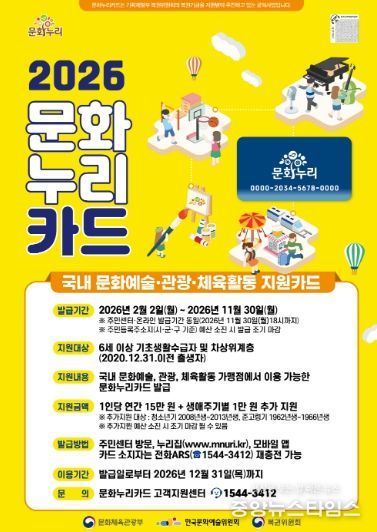 한편, 문화누리카드 지원 대상은 6세 이상 기초생활수급자와 차상위계층으로, 올해는 지난해보다 1만 원 인상된 15만 원으로 지원금이 확대됐다. 또한, 청소년기(13~18세)와 준고령기(60~64세) 대상자에게는 1만 원이 추가 지급된다.
