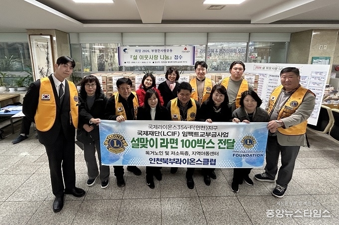 (중앙뉴스타임스 = 방재영 기자) 인천 부평구 청천2동은 10일 인천북부라이온스클럽으로부터 설 명절을 맞아 라면 100박스를 전달받았다고 밝혔다.