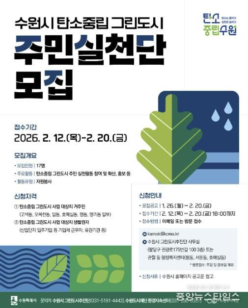 (중앙뉴스타임스 = 방재영 기자) 수원특례시가 ‘생활 속 탄소중립 실천’을 확산하기 위해 2월 12일부터 20일까지 탄소중립 그린도시 사업 대상지 주민·생활권자를 대상으로 ‘수원시 탄소중립 그린도시 주민실천단’ 신규 참여자를 모집한다.