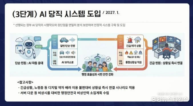 내년 1월부터는 3단계 ‘AI 당직 시스템’을 본격 가동한다. 야간시간 처리가 불가능한 단순 부서 이관 민원 등은 AI 보이스봇이 24시간 자동 접수하고, 긴급 상황·복합 민원은 즉시 통합상황실로 자동 연동되는 AI-인간(Human) 협업 방식이다. 노령층 등 디지털 약자를 위한 즉시 연결 서비스와 장애 대비 비상 인력 체계도 마련한다.