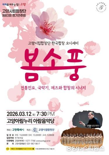 (중앙뉴스타임스 = 이광운 기자) 고양특례시를 대표하는 문화사절단인 고양시립합창단이 오는 3월 12일 저녁 7시 30분, 고양아람누리 아람음악당에서 제83회 정기연주회 ‘한국합창 오디세이: 봄소풍’을 개최한다.