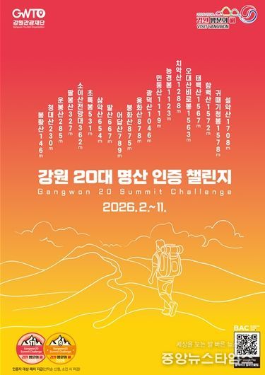 (중앙뉴스타임스 = 방재영 기자) 강원특별자치도와 강원관광재단은 오는 2월 23일부터 11월까지 ‘강원 20대 명산 인증챌린지’를 운영한다.