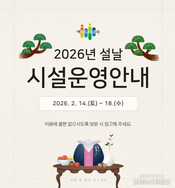 (중앙뉴스타임스 = 방재영 기자) 여주도시공사가 다가오는 2026년 설 연휴를 맞아 시민과 귀성객들이 안전하고 편안한 명절을 보낼 수 있도록 주요 시설 운영시간 조정 및 특별 서비스를 시행한다고 13일 밝혔다.