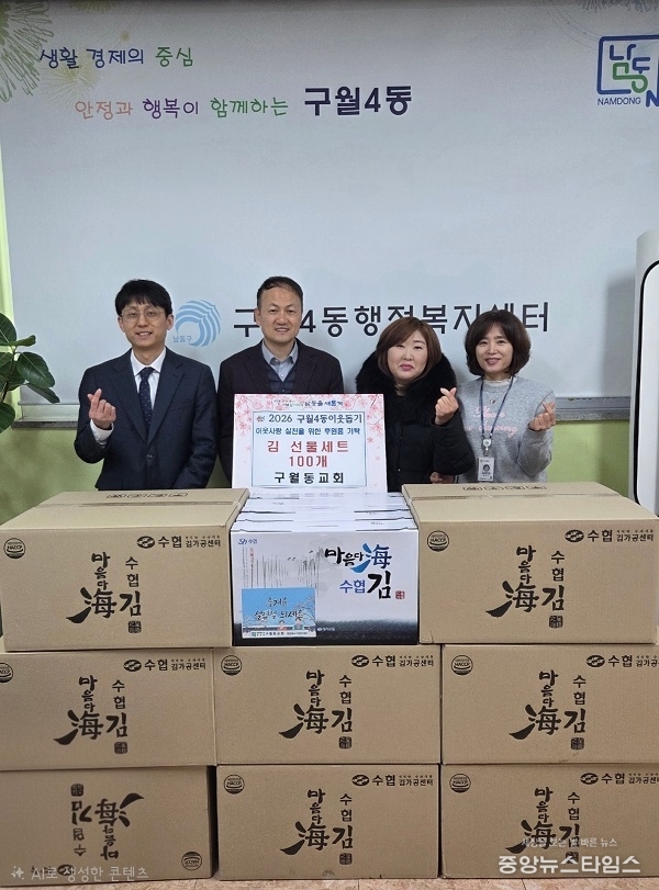 (중앙뉴스타임스 = 방재영 기자) 인천 남동구 구월4동 행정복지센터는 설을 맞아 구월동교회(담임목사 이영민)로부터 김 선물세트 100개를 후원받았다고 13일 밝혔다.