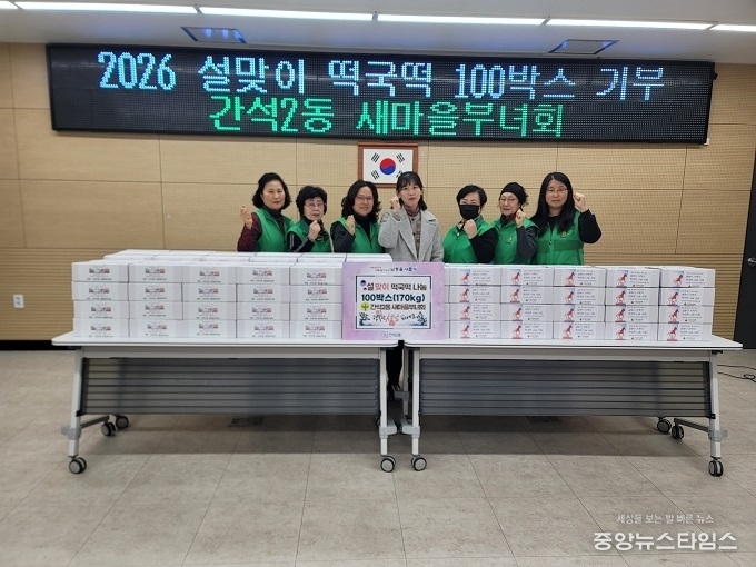 (중앙뉴스타임스 = 방재영 기자) 인천 남동구 간석2동 행정복지센터는 새마을부녀회(회장 정복순)로부터 설맞이 취약계층 지원을 위한 떡국 떡 100상자를 기탁받았다고 13일 밝혔다.