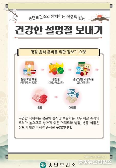 (중앙뉴스타임스 = 방재영 기자) 다가오는 설명절을 맞아 평택시 송탄보건소는 시민들이 가족과 함께 건강하고 안전한 설명절을 보낼 수 있도록 장보기부터 음식 준비, 섭취 및 보관에 이르는 전 과정에서 지켜야 할 음식관리 안전수칙을 안내했다.