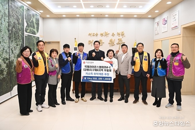 (중앙뉴스타임스 = 방재영 기자) 국제라이온스협회354-E(강원)지구 제4지역 곽매홍 부총재와 클럽회장 10명은 13일 원주시청을 방문해 저소득 취약계층을 위한 쌀(10㎏) 20포와 연탄 1000장을 전달했다.