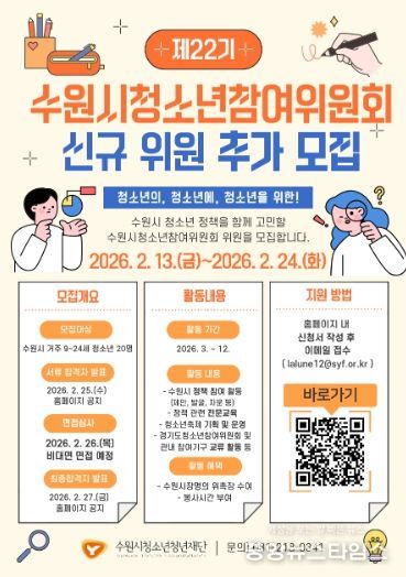 (중앙뉴스타임스 = 방재영 기자) 수원시청소년청년재단(이사장 최종진)은 수원시 청소년의 정책 참여 확대와 권익 증진을 위해 '제22기 수원시청소년참여위원회' 위원을 추가 모집한다고 밝혔다.