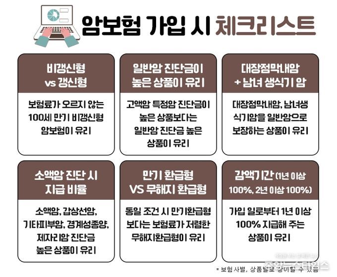 우선, 암보험을 가입하기 위해서는 갱신형 상품과 비갱신형 상품중에서 선택을 해야 한다. 갱신형은 처음 가입 시에는 보험료가 상대적으로 저렴하지만 갱신을 이어가면서 보험료가 계속 인상될 수 있고, 비갱신형은 초기 보험료는 갱신형보다 높을 수 있지만, 가입 후에 보험료인상이 없어 안정적으로 유지관리가 가능한 장점이 있다. 따라서 이러한 장단점을 고려하여 본인의 상황에 맞게 선택하는 것이 좋다.