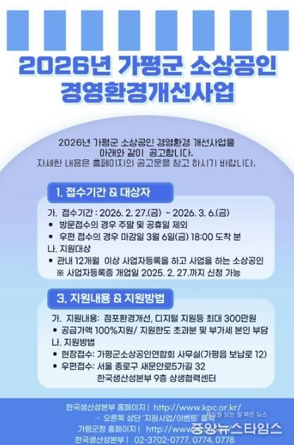 (중앙뉴스타임스 = 방재영 기자) 가평군은 관내 소상공인의 지속경영 기반을 강화하기 위해 ‘2026년 가평군 소상공인 경영환경개선사업’ 대상자를 3월 6일까지 모집한다고 19일 밝혔다.