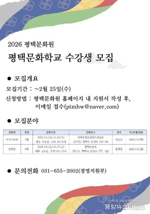 (중앙뉴스타임스 = 방재영 기자) 평택문화원은 지역 전통문화의 계승과 시민 문화향유 기회 확대를 위해 '2026 평택문화학교'를 운영하고, 총 3개 강좌 가운데 민화반과 경기도무형유산 서각장 이규남의 서각기초반 2개 강좌의 수강생을 모집한다. 모집 대상은 평택시민 누구나 가능하며, 접수는 2026년 2월 25일 오후 6시까지 선착순으로 진행된다.