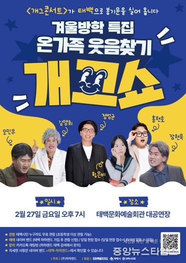 (중앙뉴스타임스 = 방재영 기자) 태백시는 겨울방학을 맞아 오는 27일 오후 7시 태백문화예술회관 대공연장에서 '온가족 웃음찾기 개그쇼'를 개최한다고 22일 밝혔다.
