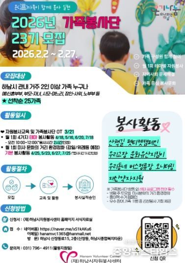 (중앙뉴스타임스 = 방재영 기자) (재)하남시자원봉사센터는 가족이 함께 참여하는 자원봉사 프로그램인‘제23기 하남시자원봉사센터 가족봉사단’참여 가족을 선착순 25가족 모집한다.