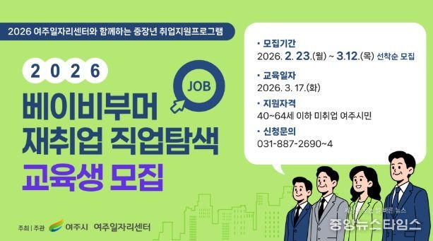 (중앙뉴스타임스 = 방재영 기자) 여주시는 베이비부머 세대의 재취업을 돕기 위해 베이비부머 재취업 직업탐색 특강 교육생을 모집한다고 밝혔다.
