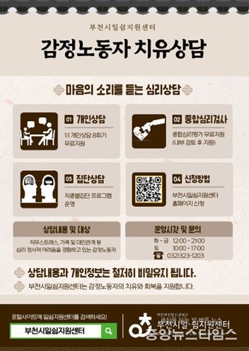 (중앙뉴스타임스 = 방재영 기자) 부천시여성청소년재단이 운영하는 부천시일쉼지원센터 치유상담실은 감정노동자에게 전문가 개인상담과 종합심리검사 등을 지원한다.